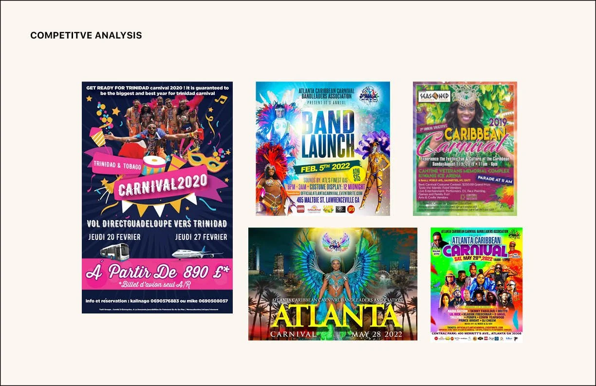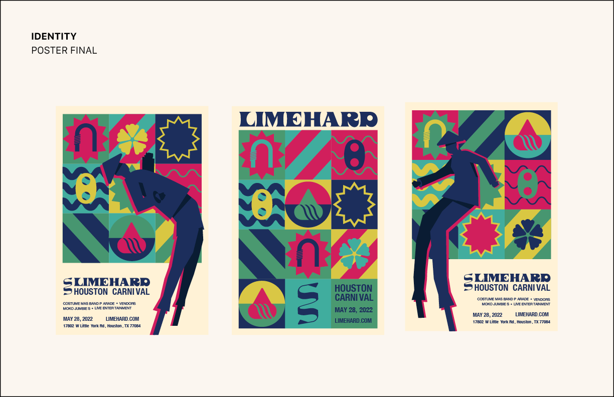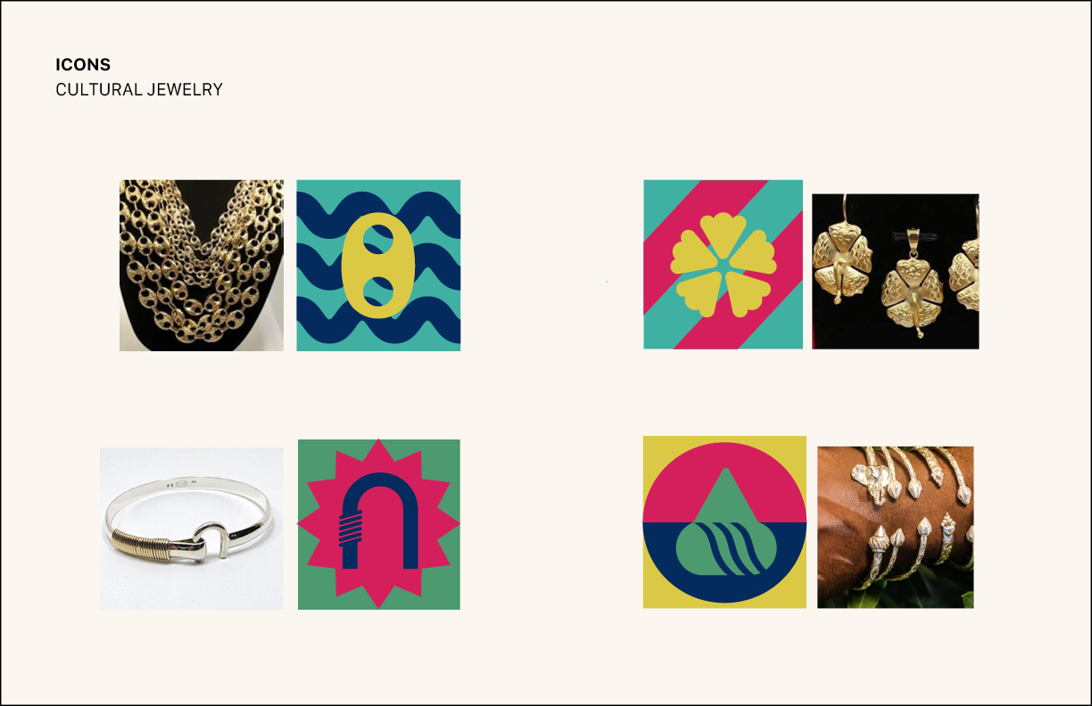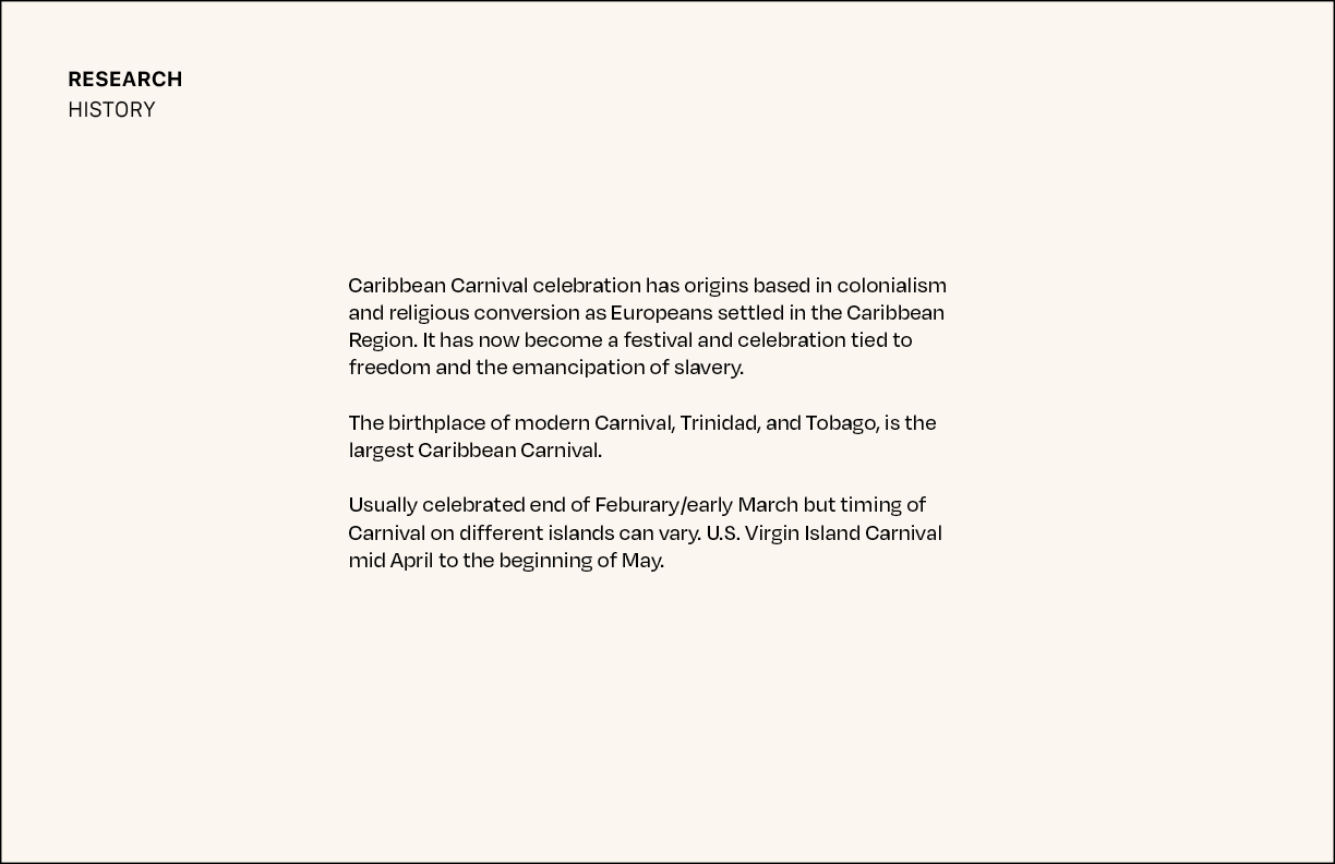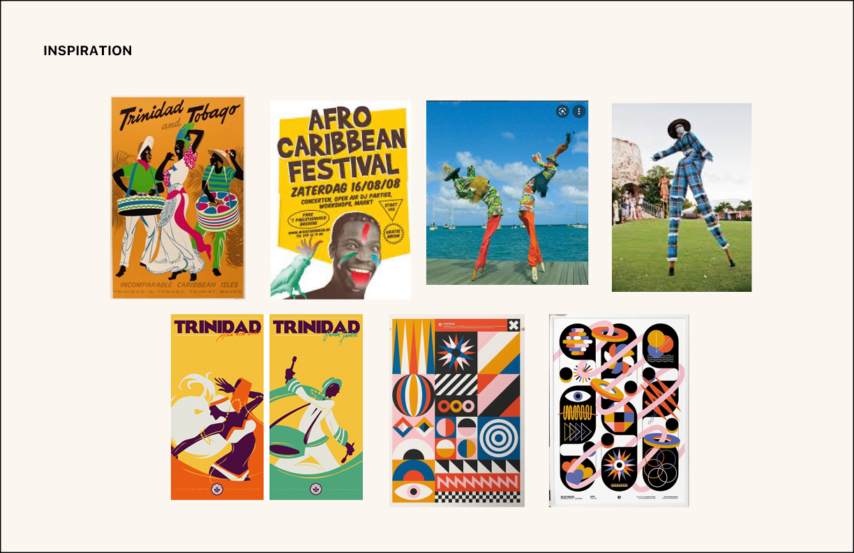 While the tradition of Carnival is celebrated in a variety of islands in the Caribbean, visual references for this event reflect the culture of the U.S. Virgin Islands. The posters feature a stilt walker, called a moko jumbie, which is the symbol of the islands. The icons used emulate popular local jewelry in the culture.